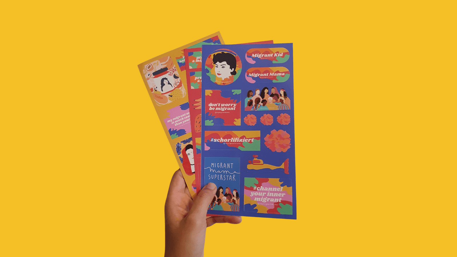 Wie kannst du Migration feiern? Du könntest deine Migrant Mama anrufen, beschließen migrant style zu kochen oder auch diese Sticker nehmen und dekorieren was geht.